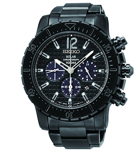 Black ion-plated stainless steel case and bracelet. Uni-directional rotating black ion-plated stainles bezel. Mwns dial with luminous skeleton hands and index hour markers. Arabic numeral marks the 12 o'clock position. Minute markers around the outer rim. Dial Type: Analog. Luminescent hands and markers. Date display between 4 and 5 o'clock positions. Chronograph - three sub-dials displaying: 60 second, 60 minute and 24 hour. Solar quartz movement. Scratch resistant Hardlex crystal. Solid case back. Case diameter: 44.70mm. Round case shape. Band width: 22 mm. Deployment clasp. Water resistant at 100 meters / 330 feet. Functions: chronograph, date, hour, minute, second. Casual watch style. Seiko Solar Chronograph Black Dial Black Ion-plated Mens Watch SSC225.Feature