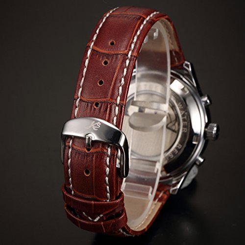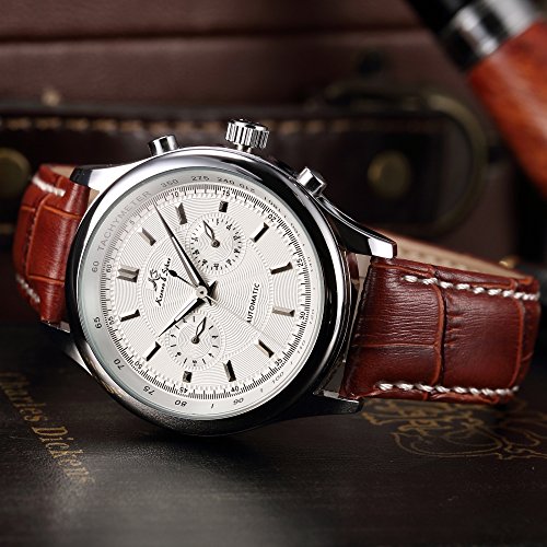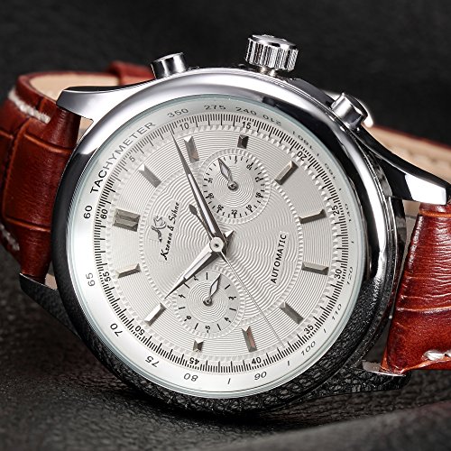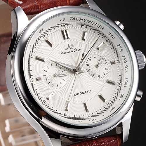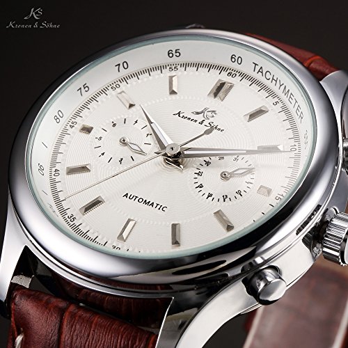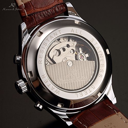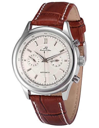 ブランド:KS 型番:KS183 発売年:2017 風防素材:グラス 表示タイプ:アナログ表示 留め金:バックル ケース直径・幅:40 mm ケース厚:15 mm バンド素材・タイプ:レザー バンド幅:20 mm バンドカラー:ブラウン 文字盤カラー:ホワイト カレンダー機能:日付曜日表示 その他 機能:日付, 曜日, 24時間表示, クリスタル, スチール 本体重量:163 g ムーブメント:自動巻き 商品パッケージの寸法: 16 x 13 x 2 cm 発送重量: 159 g メーカー型番: KS183