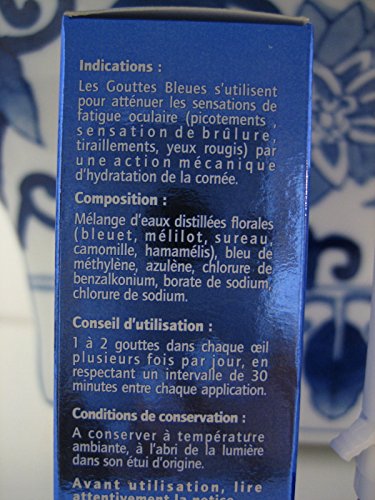 -. Binding : Health and Beauty -. EAN : 0801812046107 -. Feature : Helps gives a sparkle to eyes while allowing to relax & rest the eyes (good for contact wearers too) / Enhances any color eyes to a vibrant color / Paraben and phenoxyethanol free / Rich in natural plant extracts provides a soothing and stimulating effect. / 1 0r 2 drops in each eye, several times a day. Repeat 30 minutes between each application. -. IsAdultProduct : 0 -. Label : France -. Manufacturer : France -. PackageQuantity : 1 -. ProductGroup : Health and Beauty -. ProductTypeName : HEALTH_PERSONAL_CARE -. Publisher : France -. Studio : France -. Title : Blue Drops Sterile Hydrating Eye Lotion 10ml or 0.35oz. -. UPC : 801812046107