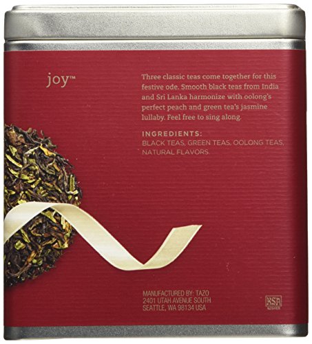 Feature : Tazo Joy full leaf Tea, a special seasonal offering for a limited time / A jubilant blend of black tea, oolong, jasmine green tea and hints of peach. / Tasting notes: floral and complex / 15 full-leaf sachets in each tin