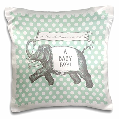 (3dRose)/Bedding Bath/Bedding/DIRECT FROM USA/3D Rose Elephant with Banner Baby Boy Announcement Over Green Polka Dots Pillow Case, 16" x 16"