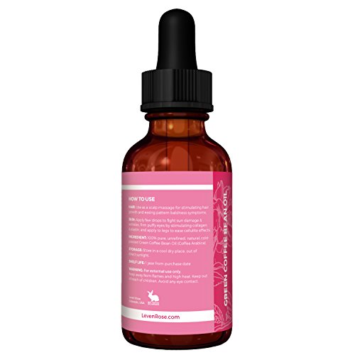 -. Feature : 100% PURE COLD PRESSED Green Coffee Bean Oil from Leven Rose for around eyes, skin and neck areas - get that firm supple skin naturally! Green Coffeebean Oil, also known as Arabica Oil, is the perfect solution for firming skin, reducing puffy eyes, and toning cellulite. Also, this light oil absorbs quickly and deeply. Great moisturizer for skin and hair. Increase hair growth and add to ends to protect from split ends and to soften dry, brittle hair. / INCREASES COLLAGEN + ELASTIN NATURALLY - This natural beauty oil has naturally occurring vitamins and fatty acids to encourage natural collagen and elastin for younger looking skin. Use this as a quick P.R.Imer and morning serum. Reduce puffy eyes and dark circles. Filled with caffeine, Green Coffee Bean Extract used topically reverses photoaging, fine lines, and wrinkles. / GREAT FOR TONING CELLULITE - Massage onto cellulite and fat patches to tone and tighten skin with the natural collagen. This will increase circulation and repair unsightly spots. Mix with a natural sugar scrub or simply massage oil onto skin daily to see best results. Also, can be used to help heal scars and stretch marks. / JUST ONE INGREDIENT - 100% pure, natural, unrefined, cold-pressed Green Coffee Bean Oil SHELF LIFE: 2 years from purchase date. MADE IN THE USA - Paraben free, cold pressed, anti animal testing, fragrance free, and cruelty free. Unscented and tropical with natural botanicals for better skincare and haircare. Coldpressed to keep the enzyme essentials active within the oil extract. / MONEY BACK GUARANTEE - Dark amber glass bottle & glass stopper extends the shelf life as oils are light sensitive and must be stored in dark amber bottles to protect them from oxidation. (Pure natural oils that are not packaged in dark bottles will lose potency and become ineffective.) Leven Rose stands behind their 100% Satisfaction Guarantee - love it or get your money back!