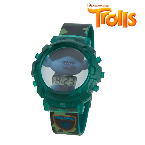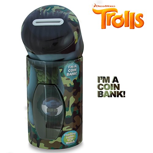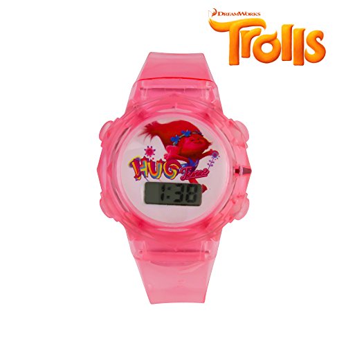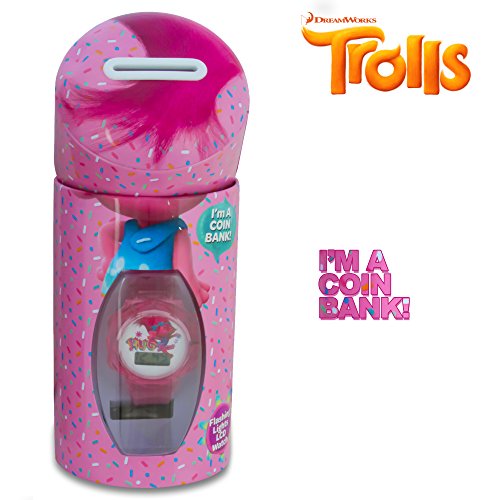 -. Binding : Watch -. Brand : Dreamworks Trolls -. Department : girls -. Feature : TIME TO SAVE: It's a watch! It's a coin bank! It's a watch that comes with a coin bank! Inspired by the Trolls movies, your child will have fun saving up their change, and enjoy sporting their favorite character on their very own watch / ACCURATE ALL THE TIME: The digital display will keep accurate time with LCD technology / FITS YOUR GROWING CHILD: A sturdy, stretchy silicone-based strap adjusts to accommodate growing kids / FLASHING LIGHTS: Light up your little one's life with the flashing light design on this watch / TIME LIMITS: Best for children 3 years and older -. ProductGroup : Watch -. ProductTypeName : WATCH -. Title : DreamWorks Trolls Kids LCD Flashing Lights Wrist Watch in a Coin Bank