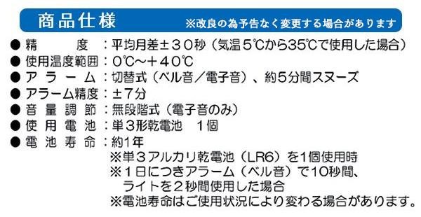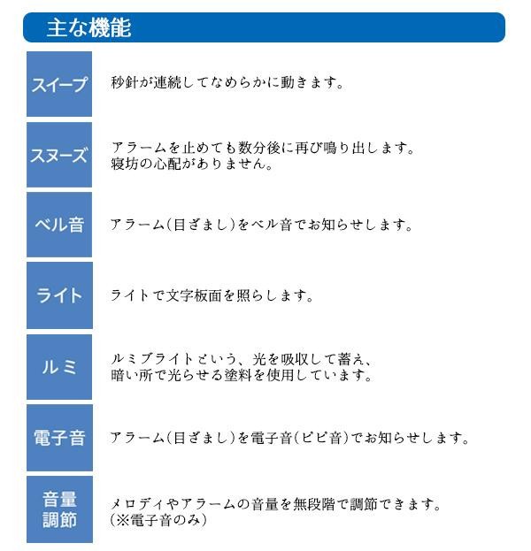 | アラーム音(ベル音・電子音)が選べる目ざまし時計です。音量調節機能つき(電子音のみ)。 |