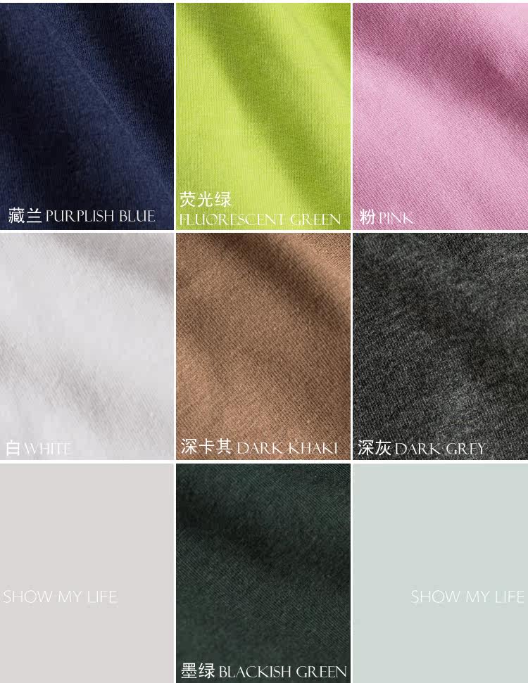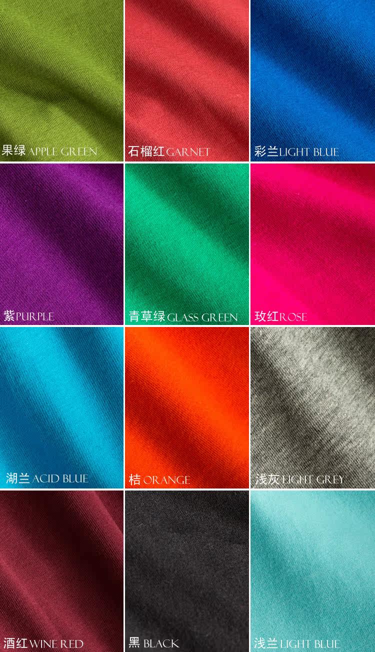 彩兰/浅兰/湖兰/酒红/深卡其/墨绿/浅灰/深灰/藏兰/黑/粉/白/荧光绿/果绿/青草绿/紫/玫红/桔/石榴红 |