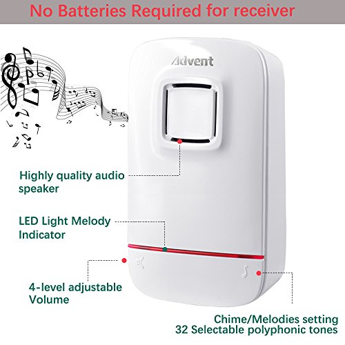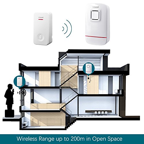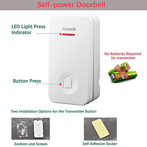 -. Feature : Fashion design make your door elegant, high end visual effects. ABS material attributes of high rigidity which is also anti-burn and impact resistance / Wireless Doorbell, Wireless range up to 200 meters that you will not miss any visitors, no matter where you are in door / 32 various melodies for you to choose for the specific receiver chime, with 4 levels volume adjustable for the wireless doorbell kit / No batteries required for transmitter, and it is rated IP47 weatherproof for outdoor use. / Easy installation, Just Plug-in receiver with 2-Pin US plug is suitable for an electrical outlet (AC). Affix the Push Button Transmitter to the wall with the provided screws, or stick it to the wall by using the enclosed double-sided adhesive tapes