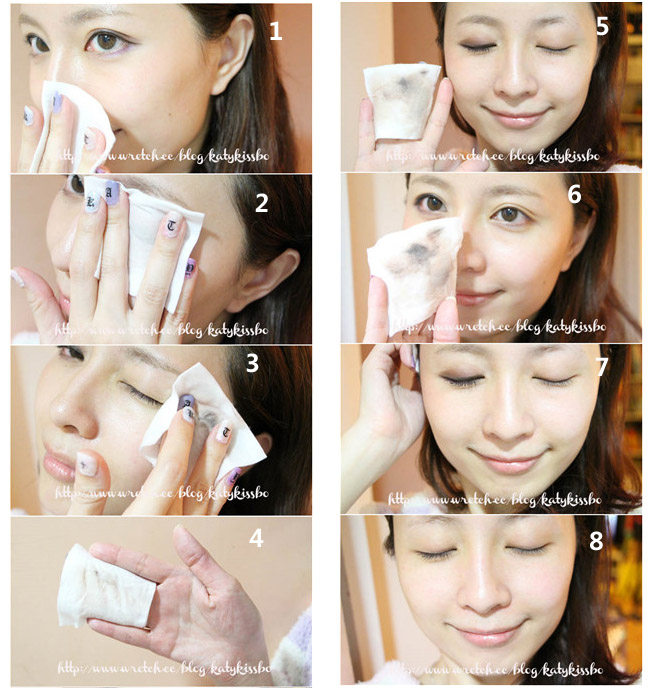 首先将化妆棉充份沾湿洁肤液。敷在眼皮上数秒。轻轻一抹已几乎带走所有基本彩妆。眼
