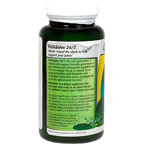 Studio : American Biosciences Publisher : American Biosciences Binding : Health and Beauty Product Description Flexsolve 24/7, the next generation of natural joint support formula, goes beyond glucosamine and chondroitin supplements. This is a unique blend of natural muco-ploysaccharides with european an australian herbs that works synergistically to fortify optimal joint function. 0