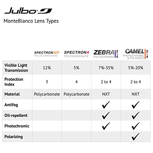 CAMEL LENS: Ideal for high altitude or desert adventures. Julbo lenses provide 100% protection from UV A, B and C rays. The Camel lens is Julbo’s highest-performing lens - polarizing, anti-fog and photochromic (cat. 2 to 4). Made from NXT, it is completely shatterproof and made with ballistic material used for helicopter windshields. The Camel lens protects from intense glare, and transitions within 25 seconds to variable light conditions, no matter the outside temperature.