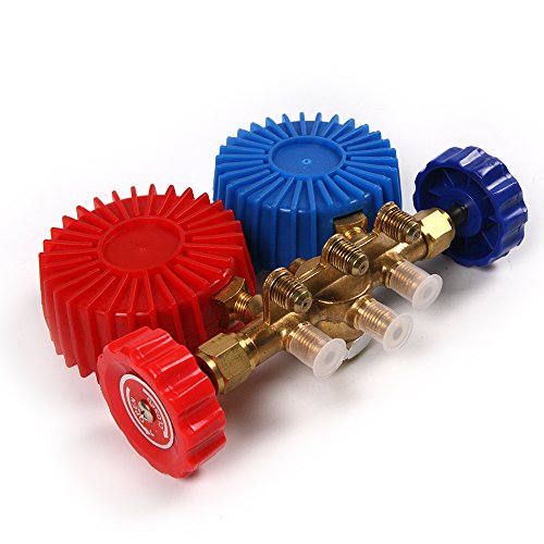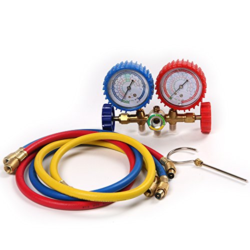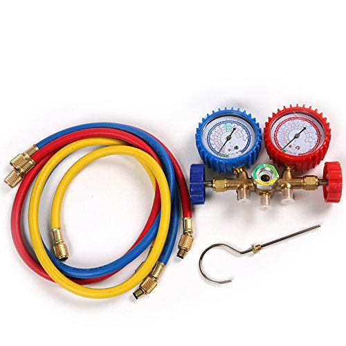 Studio : Atoplee Publisher : Atoplee Binding : Misc. Product Description Features: A/C Manifold Gauge tester 3 color-coded refrigeration charging hoses. Red blue Manifold Gauges, clear dials, vivid scales, equipped with sight glass, easy to read. This manifold gauges tools set services for diagnosing and recharging any A/C systems. Specifications: Material: Copper Plastic Total weight: about 1.15 kg Hose length: about 90 cm Components: Double table valve Three Colored-hoses Balance hook(as pictures shown) Package Included: 1x Manifold Gauges Tools Set 0