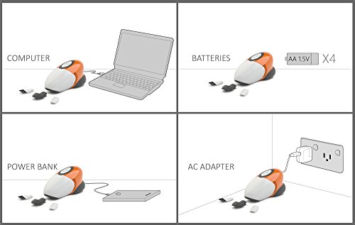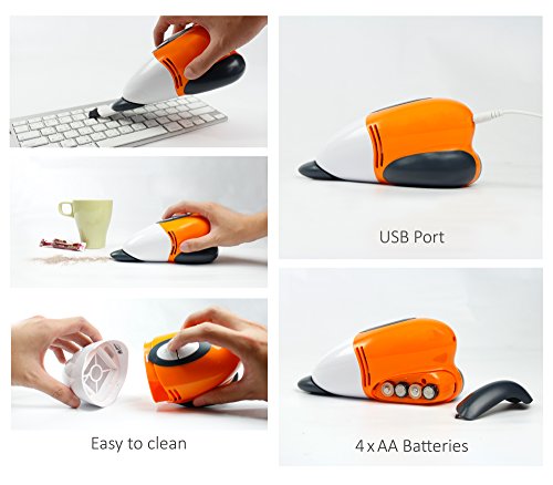 -. Feature : COMPACT, PORTABLE, LIGHTWEIGHT: Ideal for cleaning your desk, keyboard, computer, kitchen countertop, work space, craft table, etc. / SIMPLE DESIGN: Large ON/OFF button for easy switch-on and quick release for emptying the trash / MAXIMUM CONVENIENCE: 3 sweeper tools help to clean tight corners, plus a built-in dust case eliminating the need for dust bags / ENERGY SAVING: Powered by 5V universal USB outlet (NOT for battery charging) or 4 x AA batteries (NOT included) / FOR EVERYDAY USE: Perfect for cleaning up crumbs, coffee grounds, craft materials, pencil or eraser shavings, dust buildup, and more