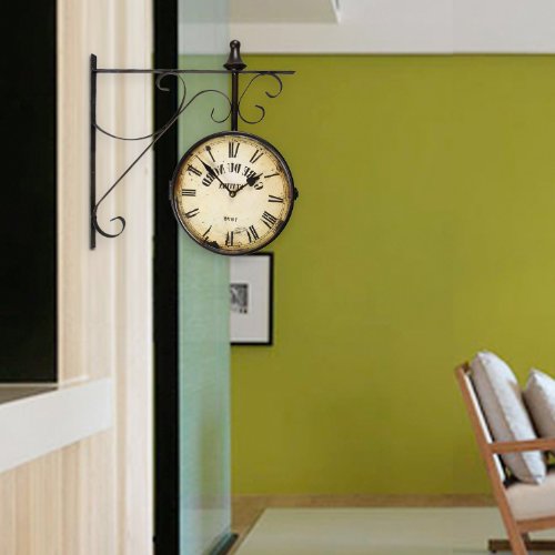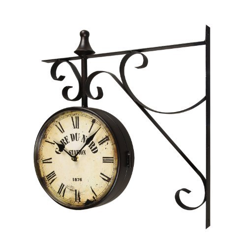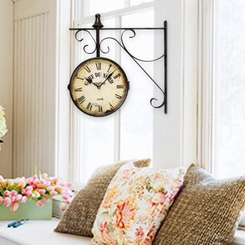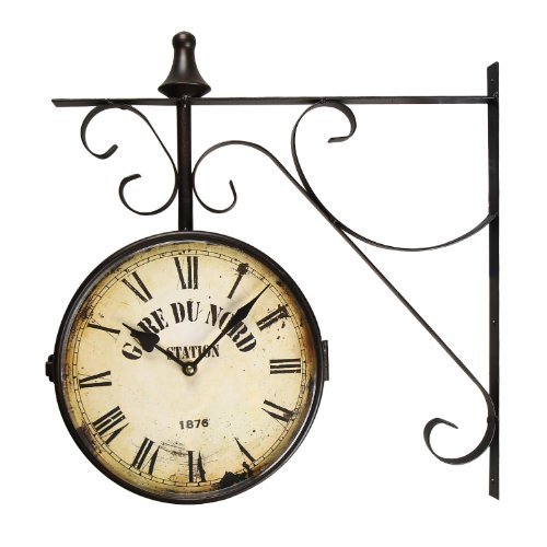 -. Binding : Kitchen -. Brand : Adeco -. Color : Black -. EAN : 0663489011617 -. Feature : Wall mount is easy to hang / Features a double sided clock in an antique style / Requires two aa batteries (not included), no second hand / Material: iron; colors: black iron, off-white, distressed effect / Dimensions: 16.1x16.1x3.1" -. IsAutographed : 0 -. Label : Adeco -. Manufacturer : Adeco -. Model : CK0003 -. MPN : CK0003 -. NumberOfItems : 1 -. PackageQuantity : 1 -. PartNumber : CK0003 -. ProductGroup : Home -. ProductTypeName : HOME -. Publisher : Adeco -. Studio : Adeco -. Title : Adeco Black Iron Vintage-Inspired Round "Gard Du Nord Station" Double-Sided Wall Hanging Clock with Scroll Mount Home Decor -. UPC : 663489011617