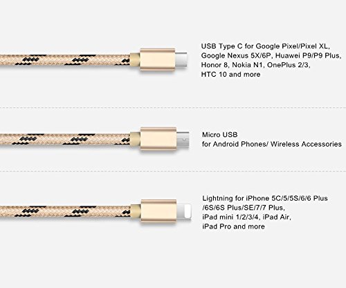 - Multi 3 in 1 charging cable with Lightning for iPhone 5 / 5S / 6 / 6 Plus / 6S / 6S Plus / SE / 7 / 7 Plus & iPad / iPad Mini / iPad Pro, USB Micro for Android Phones & Wireless Accessories, and USB Type C for Apple New MacBook 12 Inch, 2015 Google Chromebook Pixel / Pixel C, Samsung Galaxy S8 / S8 Plus, LG G5 / G6, Google Pixel / Pixel XL, Google Nexus 5X / 6P, Huawei P9 / P9 Plus, Honor 8, HP Pavilion x2, Nokia N1, OnePlus 2 / 3, HTC 10 and more.
