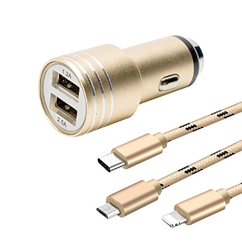 Chino-E 2.5 Dual USB Car Charger with 3 in 1 Multiple Charging Cable for Type C / Lightning / Micro,Car Safety Hammer Function
