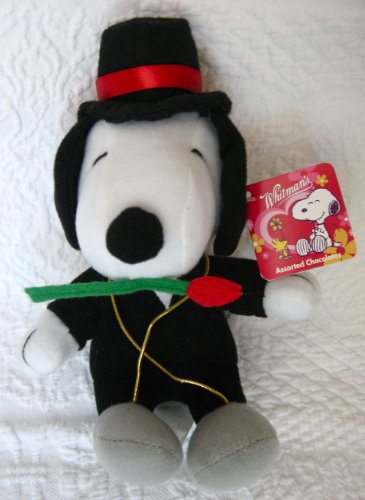 -. Binding : Toy -. Brand : Whitman's -. Feature : Whitman's tuxedo snoopy. / Measures approx. 8" tall. / Wearing tuxedo and tophat! / Carrying a rose in his mouth. -. IsAdultProduct : 0 -. Label : Russell Stover Candies -. Manufacturer : Russell Stover Candies -. ProductGroup : Toy -. ProductTypeName : TOYS_AND_GAMES -. Publisher : Russell Stover Candies -. Size : 6 inches -. Studio : Russell Stover Candies -. Title : Snoopy Valentine Day's 6" Plush Dog in Tuxedo with Rose
