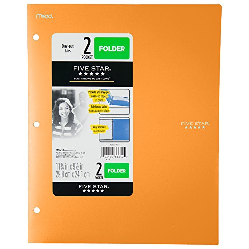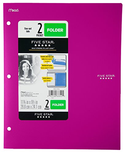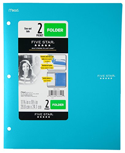 -. Binding : Office Product -. Brand : Five Star -. Color : Blue -. EAN : 0043100333425 -. Feature : Durable, one-piece plastic construction is able to withstand rough wear and tear / Stay-put tabs on the inside of the pocket folder capture the top corner of your papers so they "stay put". Reinforced spine also keeps papers in place. / Three-hole punched to store in your favorite Five Star binder; cover is opaque to maintain a neat and clean appearance; assorted colors - color selected for you may vary -. IsMemorabilia : 0 -. Label : ACCO Brands -. Manufacturer : ACCO Brands -. Model : 33342 -. MPN : 33342 -. NumberOfItems : 1 -. PackageQuantity : 1 -. PartNumber : 33342 -. ProductGroup : Office Product -. ProductTypeName : OFFICE_PRODUCTS -. Publisher : ACCO Brands -. Studio : ACCO Brands -. Title : Five Star Binder Pocket Folder, Stay-Put 2-Pocket Folder, 9-1/2"x 11-3/4", Color Selected For You May Vary (33342) -. UPC : 043100333425