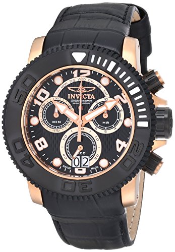-. Binding : Watch -. Brand : Invicta -. Color : black -. Department : mens -. EAN : 0886678111688 -. Feature : Swiss quartz movement / Flame-fusion crystal; 18k rose gold ion-plated stainless steel case; black leather strap / Chronograph functions with 30 minute, 60 second and 12 hour rose gold tone subdials; date function / Black textured dial with rose gold hands; white hour markers and arabic numerals; days of the week at 12:00; luminous; unidirectional black rubber bezel; 18k rose gold ion-plated stainless steel and black rubber crown and pushers; exhibition case back / Water resistant to 990 feet (300 M):suitable for scuba diving to a depth of 30 meters for up to 2 hours -. Label : Invicta -. Manufacturer : Invicta -. Model : 11168 -. MPN : 11168 -. PackageQuantity : 1 -. PartNumber : 11168 -. ProductGroup : Watch -. ProductTypeName : WATCH -. Publisher : Invicta -. ReleaseDate : 2012-08-09 -. Studio : Invicta -. Title : Invicta Men's 11168 Sea Hunter Pro Diver Chronograph Black Textured Dial Watch -. UPC : 886678111688