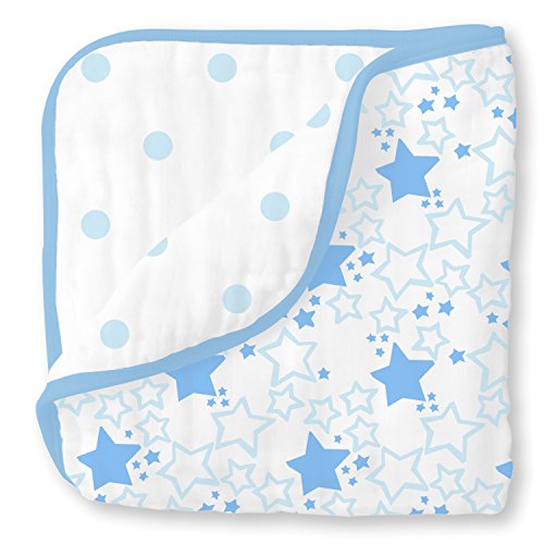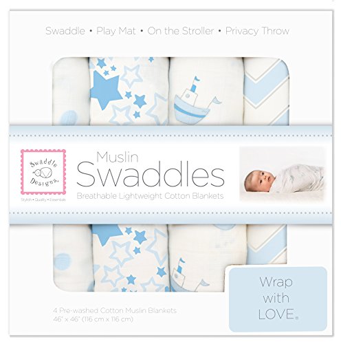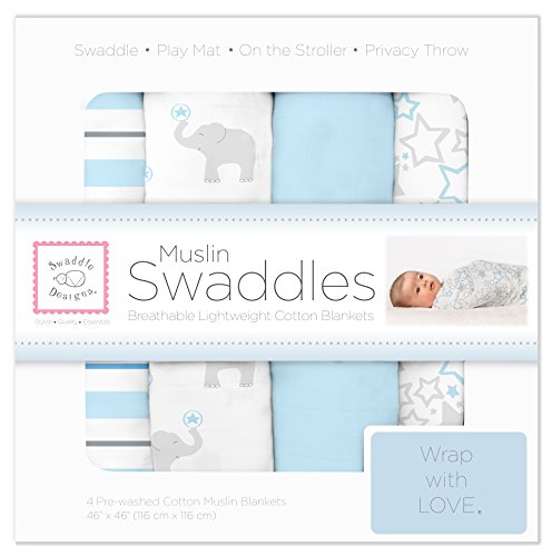 Wrap your baby in pure softness. Rest easy when your baby is lovingly swaddled in premium 100% cotton muslin. Our SwaddleDesigns quality muslin with cheerful designs and comforting colors gets softer with every wash. The open weave increases breathability and reduces the risk of overheating. The generous size and our helpful labels make swaddling easy as 123. Beyond swaddling, use as a nursing cover, sunshield on the stroller, playmat for tummy time, and more. Set of 4 packaged in a box. Each 46 x 46 inches (116 x 116 cm). Coordinates with a variety of our quality baby essentials. Machine wash gentle.Feature