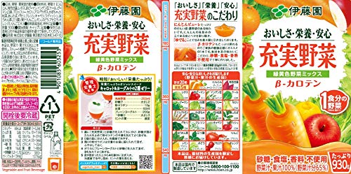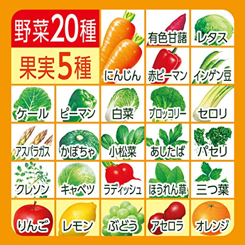 原材料:野菜汁(にんじん、有色甘藷、レタス、赤ピーマン、インゲン豆、ケール、ピーマン、白菜、ブロッコリー、セロリ、アスパラガス、かぼちゃ、小松菜、あしたば、パセリ、クレソン、キャベツ、ラディッシュ、ほうれん草、三つ葉)、果汁(りんご、レモン、ぶどう、アセロラ、オレンジ)、りんごエキス