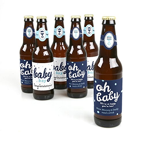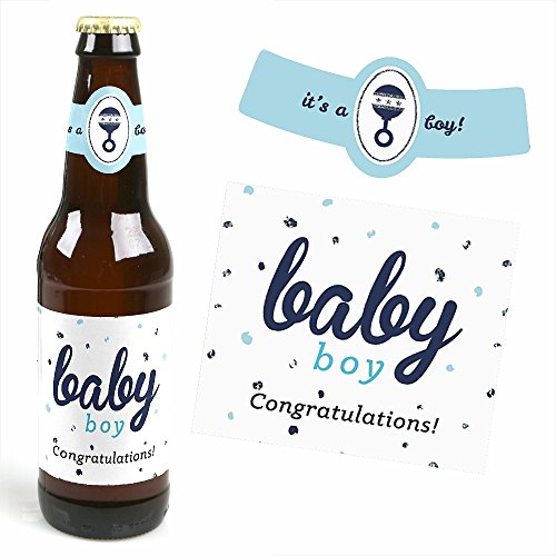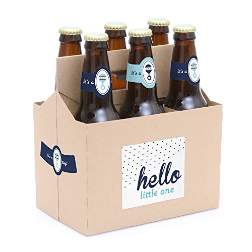 Hello Little One - Blue and Silver - 6 Beer Bottle Labels Boy Baby Shower with 1 Beer Carrier