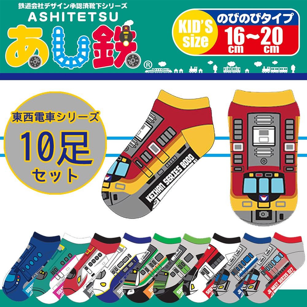 履いたら「列車」になるデザインのキッズソックス。東西電車をモチーフにデザインされた10柄の靴下がセットになっています。 |
