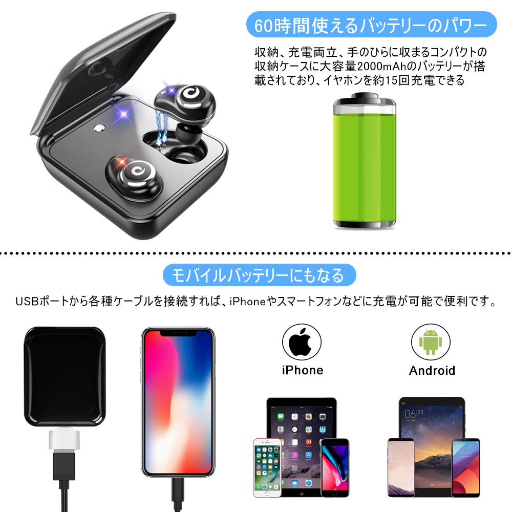 ●【2000mAh超大容量充電ケース】:2000mAh大容量イヤホンケースで片耳へ最大30回繰り返し充電が出来。2000mAhの予備電力内蔵ケースと併用することで、連続再生時間が最大60時間まで実現します。また、臨時モバイルバッテリーとして、スマホなどのデバイスを充電することができます。通勤往復、旅行中等外出しても電量不足を心配せず、ご安心して使用いただきけます。