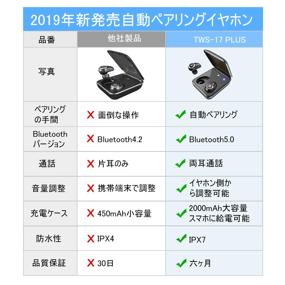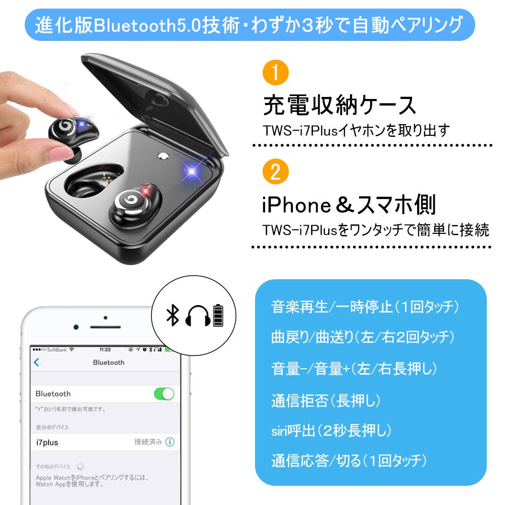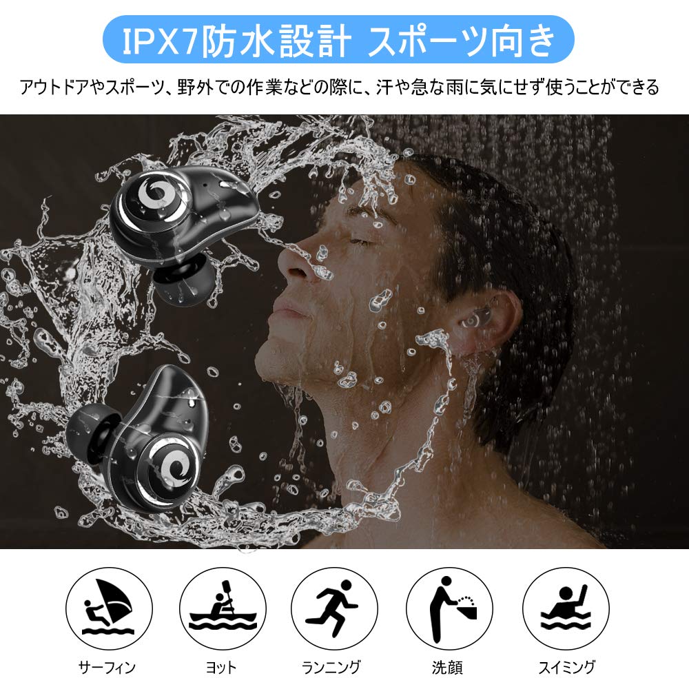 ●【自動ペアリング&IPX7防水】:複雑な操作が不要で、ケースから取り出すとイヤホン同士のペアリングが自動的にされるので、あとはデバイスをワンタップするだけで簡単にペアリングが完了です。初めてBluetooth イヤホンご使用する方にも、とても便利で使いやすいです。IPX7级防水設計により水の侵入を防ぐ、水洗い、汗や水しぶき、急な雨などからイヤホンを守る防水仕様。スポーツやエクササイズなどのアクティブシーンに最適スポーツイヤホンです。※ご注意:充電ケースは防水仕様ではありません。