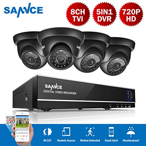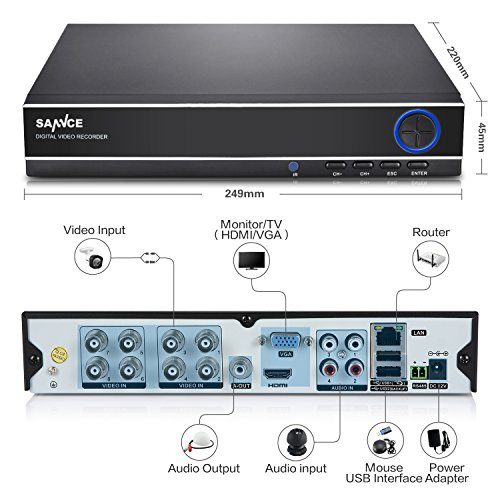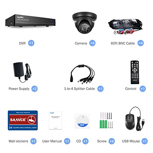 SANNCE 8CH 1080N DVR w/ 720P Weatherproof Professional CCTV Cameras 720P HD professional cameras High quality weatherproof metal dome camera provide a crisp, clear, and smooth image utilizing 720P of resolution. Perfect remote access and control your system Connect your smartphone or tablet to your system with a quick scan of the QR Code, remote access has never been so easy. Motion Detection & email alert Email alerts if motion is detected, catching every essential moment, save hard drive record storage. Day and night full day monitoring Each camera owns 24pcs premium IR LEDs which can record up to 85ft away in total darkness to provide protection day or night. Specifications: * 1/4'' color image sensor * Super 720P compatibility high resolution * Build-in IR-cut filter, color on day, auto switch to B&W at night * 24pcs build in LEDs, up to 85ft superior night vision * Weatherproof: IP66 degree for indoors and outdoors * H.264 Compression maximizes hard drive's recording time * Video input/output: 8CH BNC/ 1CH VGA, 1CH HDMI, 1CH BNC * Audio input/output: 4CH RCA/ 1CH RCA * PTZ control: 1*RS485 * HDD: 1* SATA port (Max 4T) * Revolutionary improvements on video streaming Our easy-to-assemble kit includes: * 1×8CH DVR, NO HDD included * 4×720P wired cameras * 2×12V 2A power supply * 1×IR remote control * 4×60ft video power cable * 2×4-1 splitter cable * 1×USB mouse * 1×User manual& CD Warranty:1 Year Free Warranty + Lifetime Technical Support via Email & Telephone For detailed specific instructions, please visit ourknowledgebase Web: annke dot com /kb/Feature