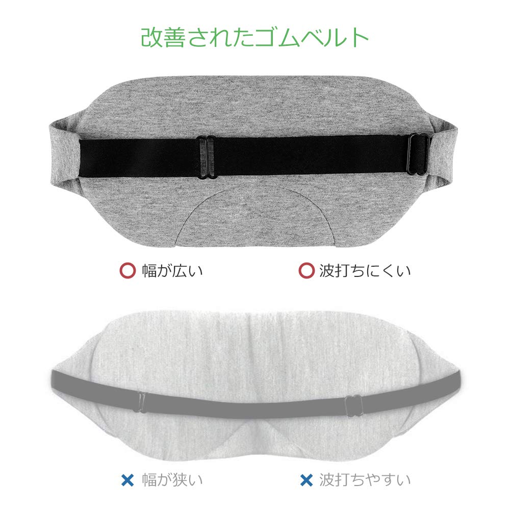 改善された点:優れた素材で肌にやさしく、通気性が大幅に上がっております。ベルトの部分は従来の商品と比較し、幅がより一層広くなっており、付け心地が良くなります。高品質の素材で作られているので波打つことはないです。鼻の部分は適宜に処理され、遮光性もかなりアップされました。