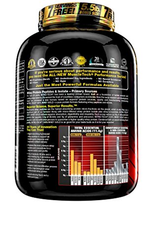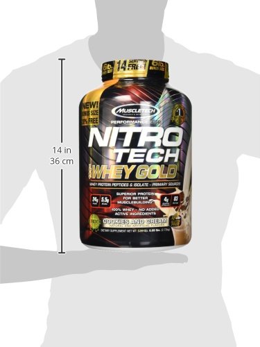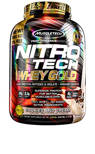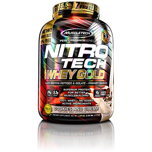 NITRO-TECH 100% WHEY GOLD is a superior 100% whey protein powder designed for men and women looking to improve recovery, build lean muscle, improve strength and enhance performance. NITRO-TECH 100% WHEY GOLD from MuscleTech contains pure whey protein isolate and peptides as the primary protein source. Every scoop provides 24 grams of ultra-pure whey protein, 5.5 grams of Branched Chain Amino Acids (BCAAs) and 4g of glutamine and peptides. What’s more, it’s great-tasting flavors don’t pack the extra sugar and carbs you’ll see in other whey protein powders. Plus, for a limited time, you 10% more protein for free! Try the bonus size today! EASY MIXING: Mix 1 scoop with 5 oz. of cold water or skim milk in a glass or shaker cup. Use between major meals and before and after exercise. Read the entire label before use and follow directions provided STACKING GUIDE: NITRO-TECH 100% WHEY GOLD provides the building blocks for lean muscle and recovery. It stacks well with MuscleTech Platinum 100% Creatine, MuscleTech AminoBuild Next Gen, MuscleTech VaporX5 Next Gen and Clear Muscle. 0 |