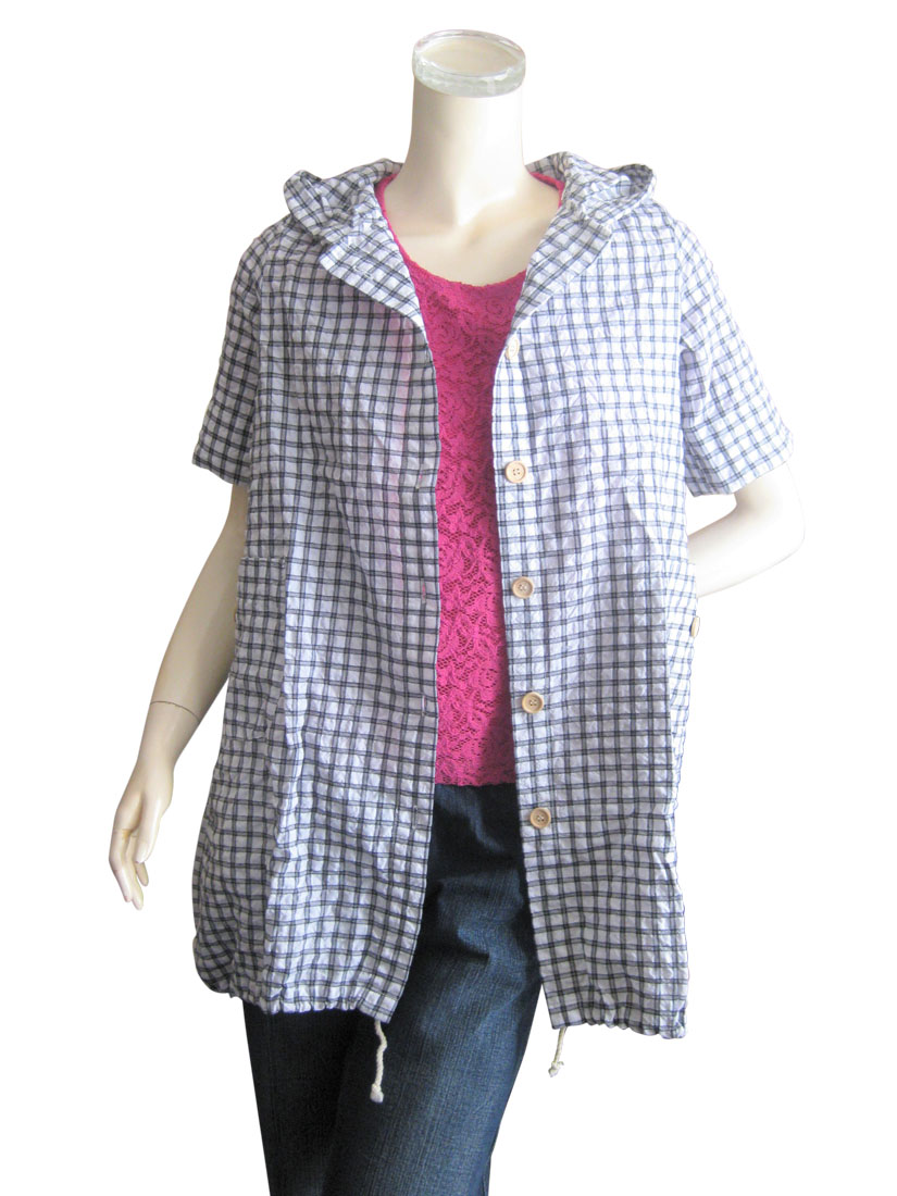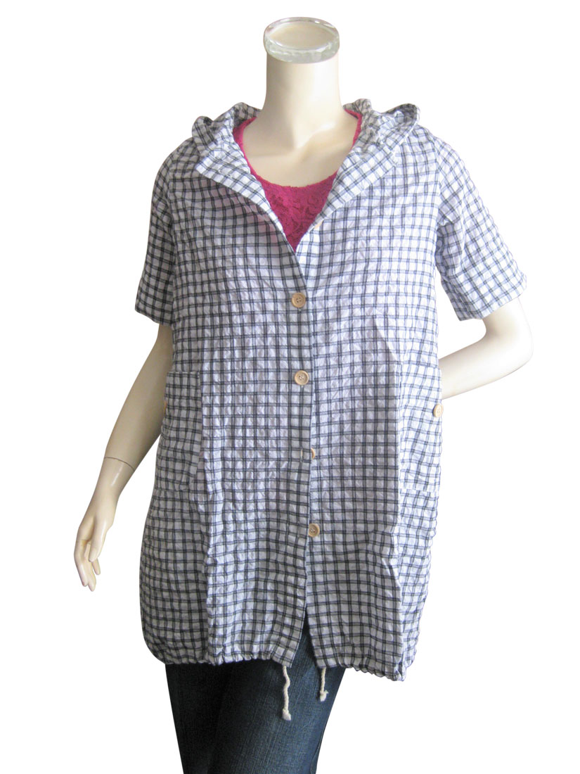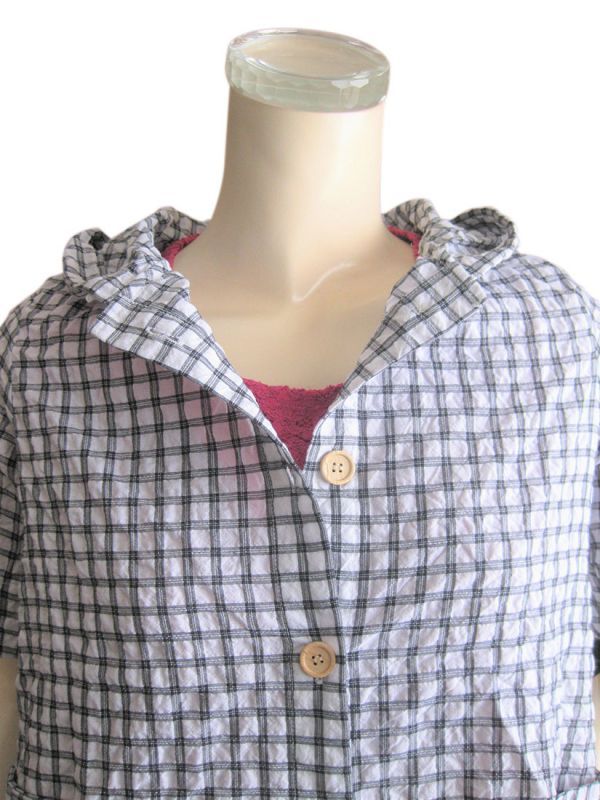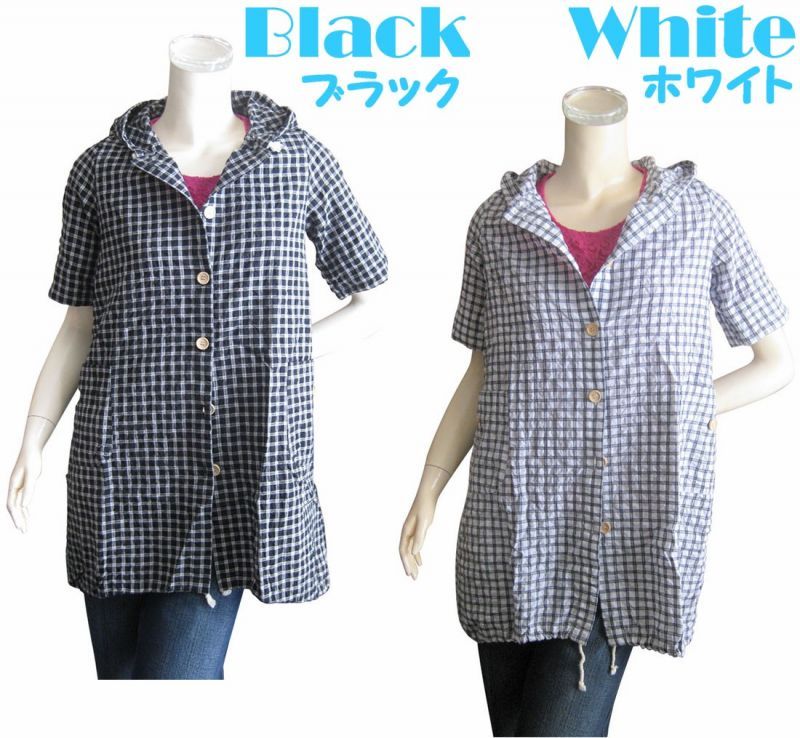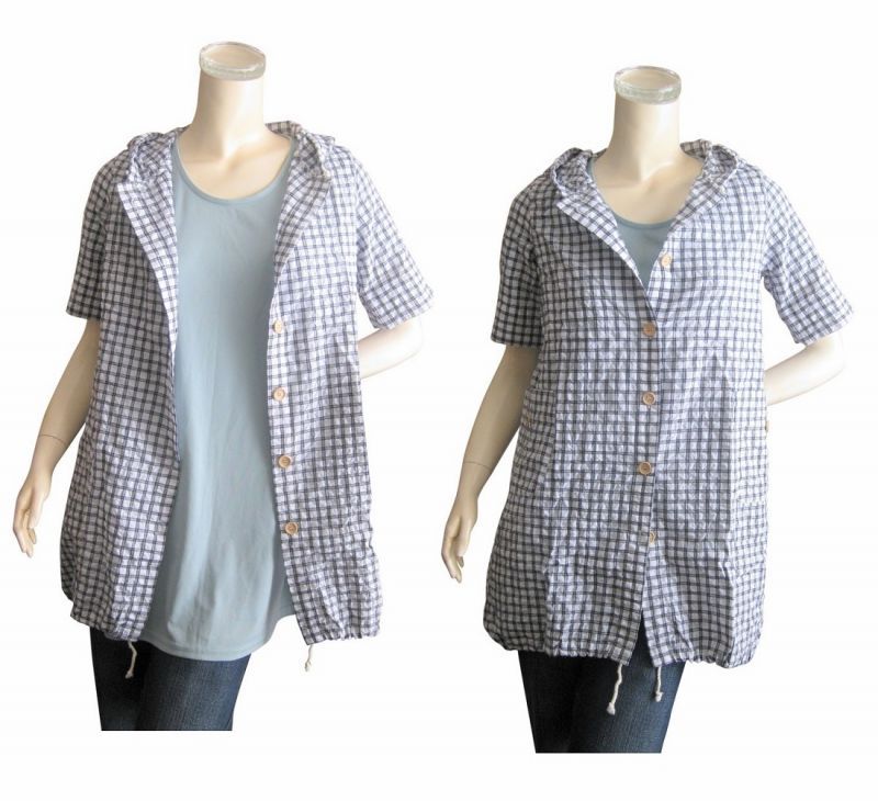 【ゆったりサイズ】綿混フード付きチェック柄半袖シャツ/スピンドルパーカー