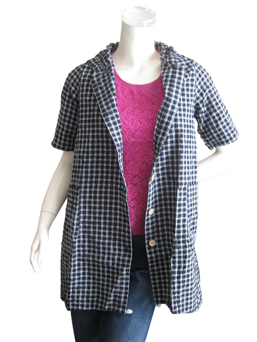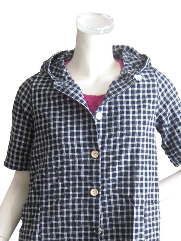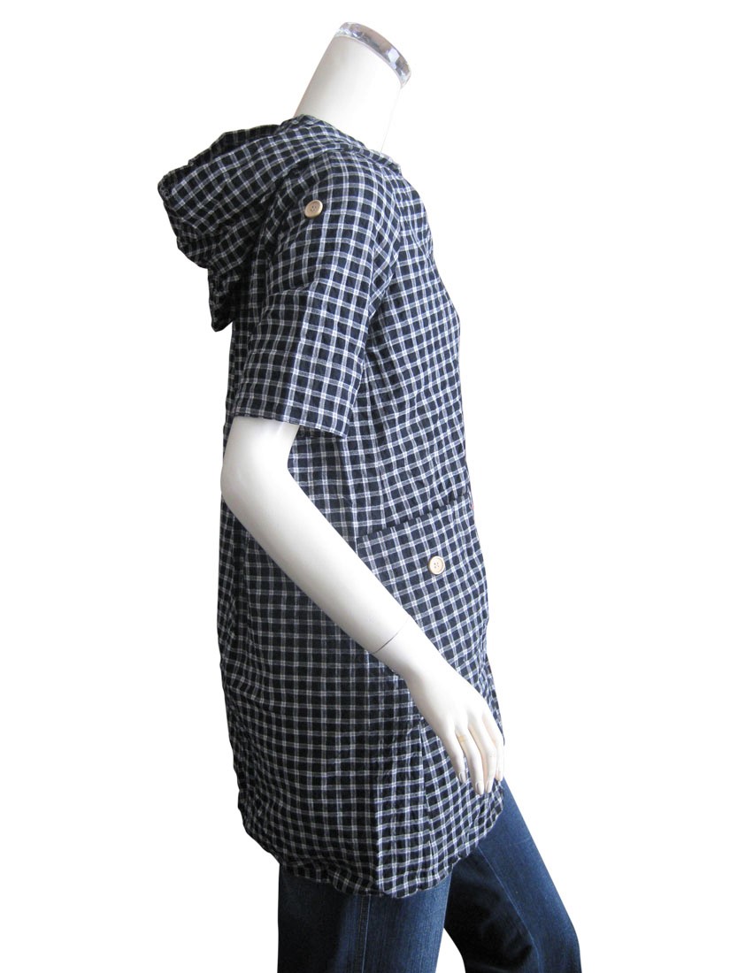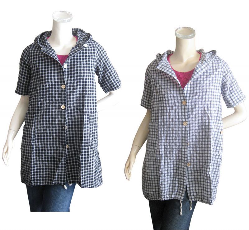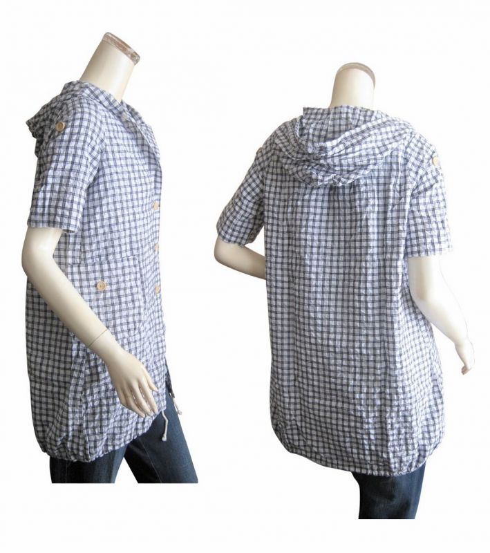 【ゆったりサイズ】綿混フード付きチェック柄半袖シャツ/スピンドルパーカー