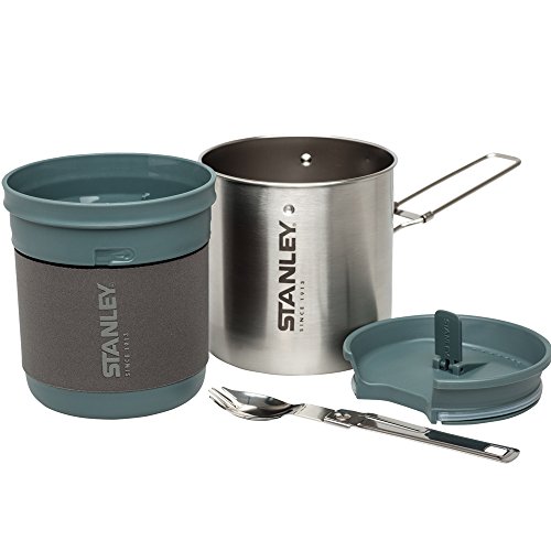 Stanley mountain 24oz compact cook set delivers the legendary durability and thermal performance in this versatile and packable set. We offer never-before-seen ways to take, prep, cook and enjoy food and drink in the outdoors. Integrated cook set includes nesting pot with vented lid, mug/bowl and folding spark. The vented, melt resistant nylon lid doubles as strainer for pot and drink thru lid for mug/bowl. Mug/Bowl have volumetric markings. Neoprene wrap keeps cool to touch. A standard fuel canister or ultra light stove stores in cook set.Feature