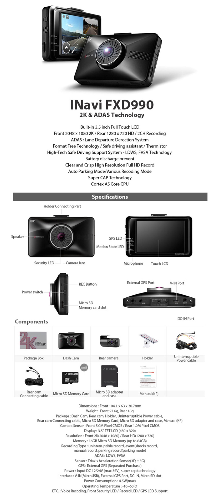 Package : Dash Cam, Rear cam, Holder, Uninterruptible Power cable, Rear cam Connecting cable, Micro SD Memory Card, Micro SD adapter and case, Menual (KR)
