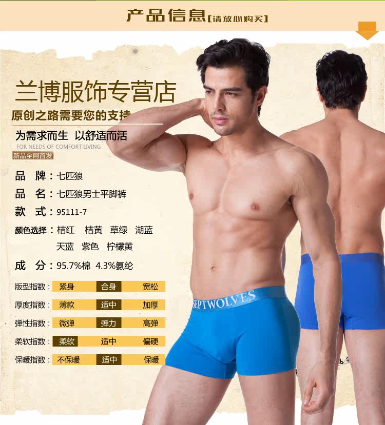 ?Septwolves/七匹狼星期裤男士内裤平角裤修身简约自然U凸四角裤衩 ?