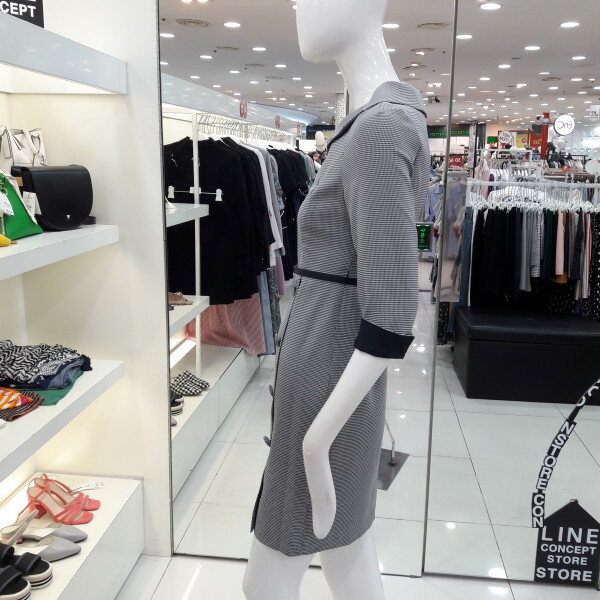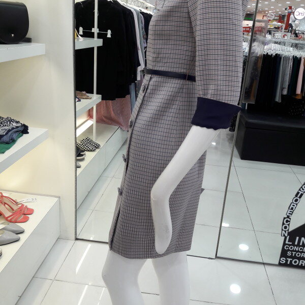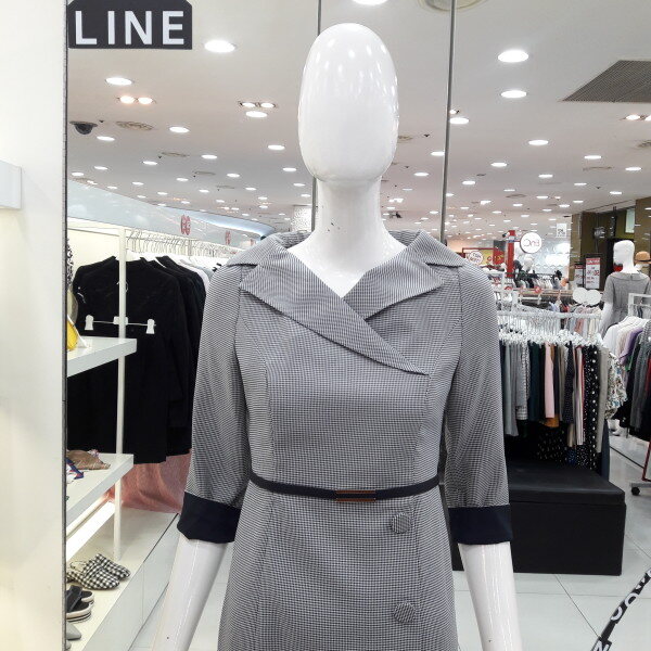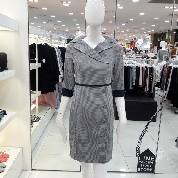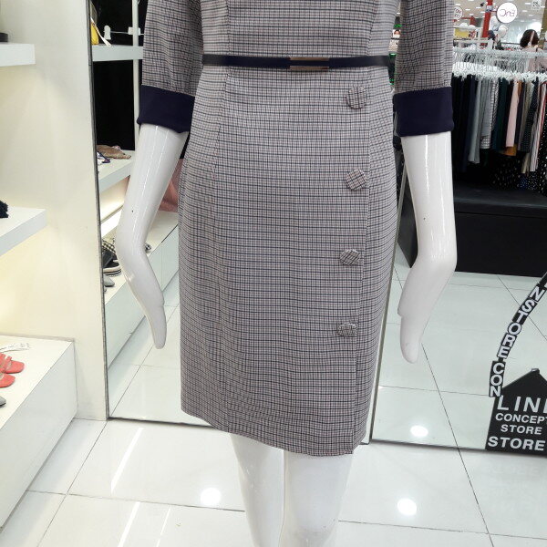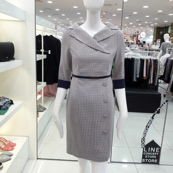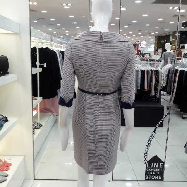 18년 가을전략 보트넥선의 세련된 체크원피스입니다 소매배색 포인트가 있으며 탈부착되는 벨트가 허리라인을 슬림하게 해주는 디자인입니다 모임룩 하객룩으로 추천합니다