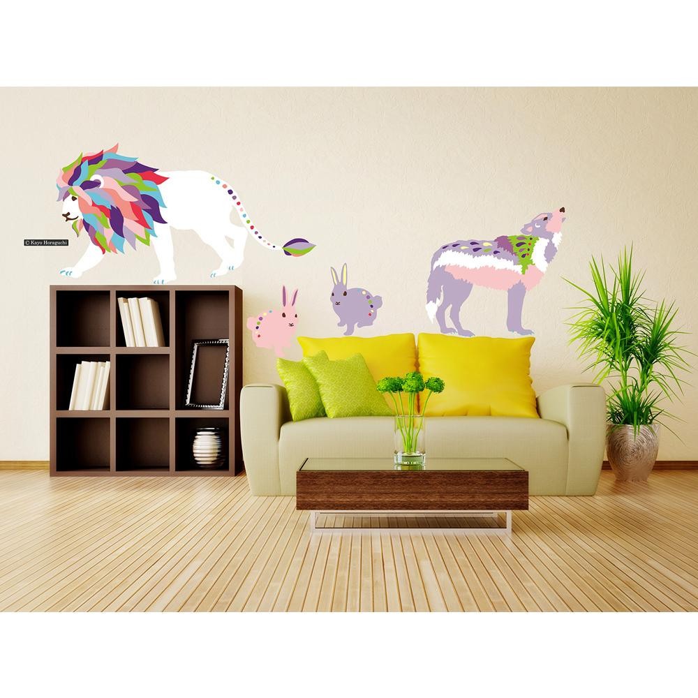 | カラフルなたてがみのライオンやドット模様のおしりのウサギ、素敵な毛皮のオオカミたちが可愛らしく過ごしている様子のウォールステッカーです。自分だけのレイアウトで貼ってお楽しみください。 |