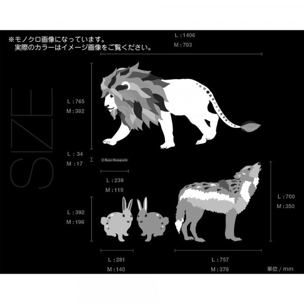 カラフルなたてがみのライオンやドット模様のおしりのウサギ、素敵な毛皮のオオカミたちが可愛らしく過ごしている様子のウォールステッカーです。自分だけのレイアウトで貼ってお楽しみください。 |