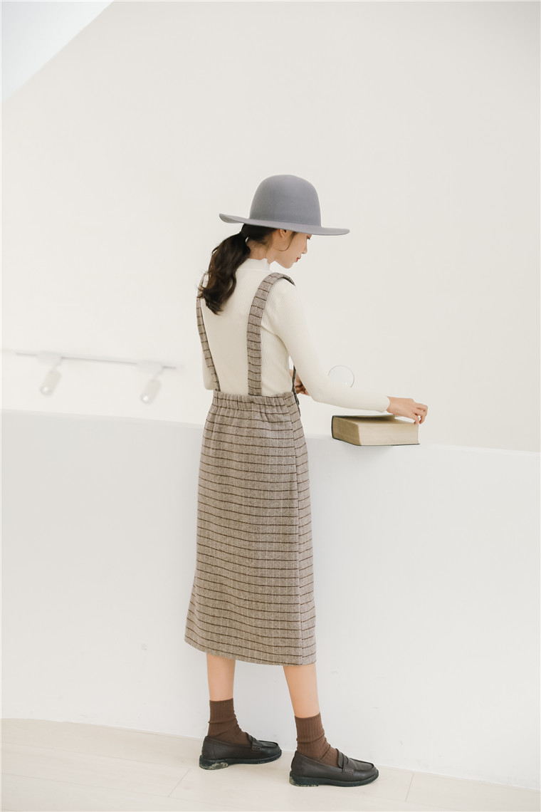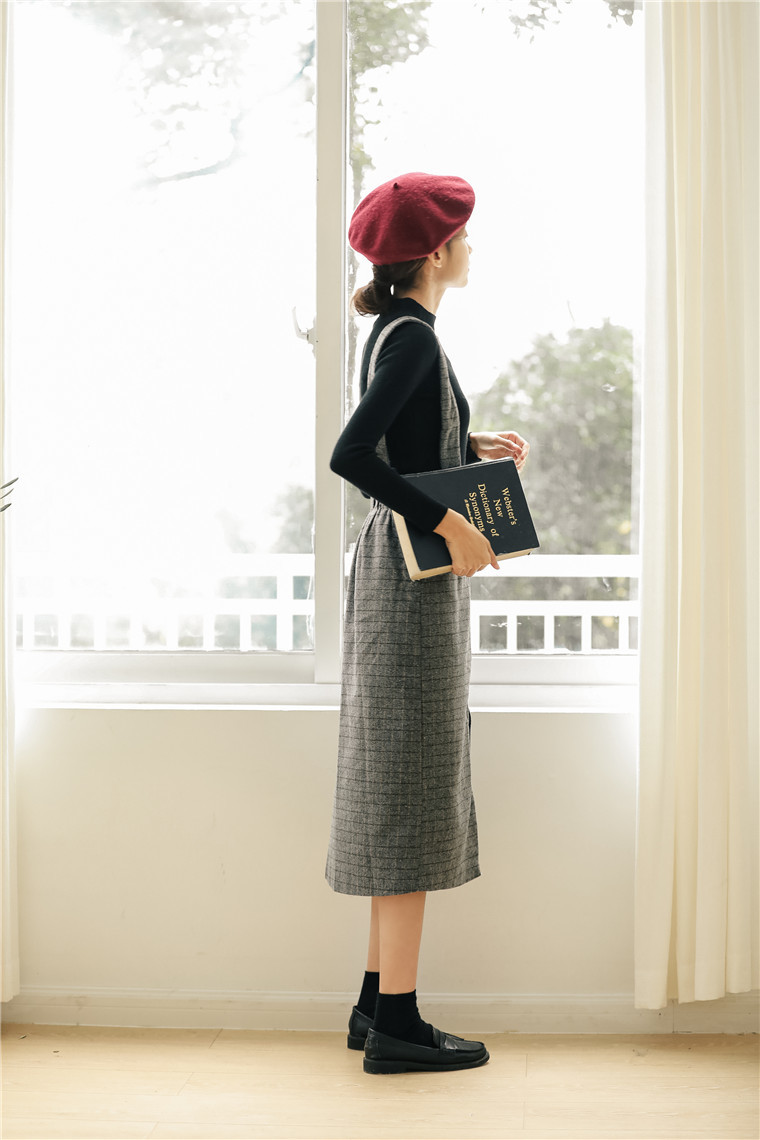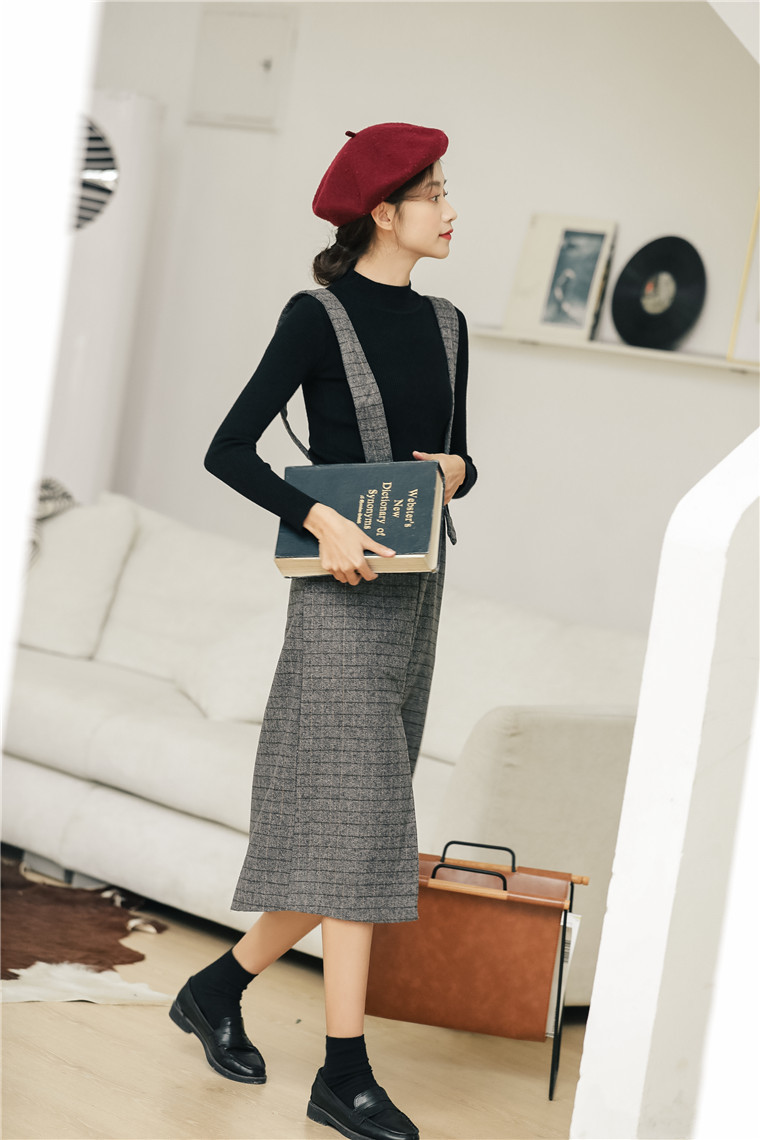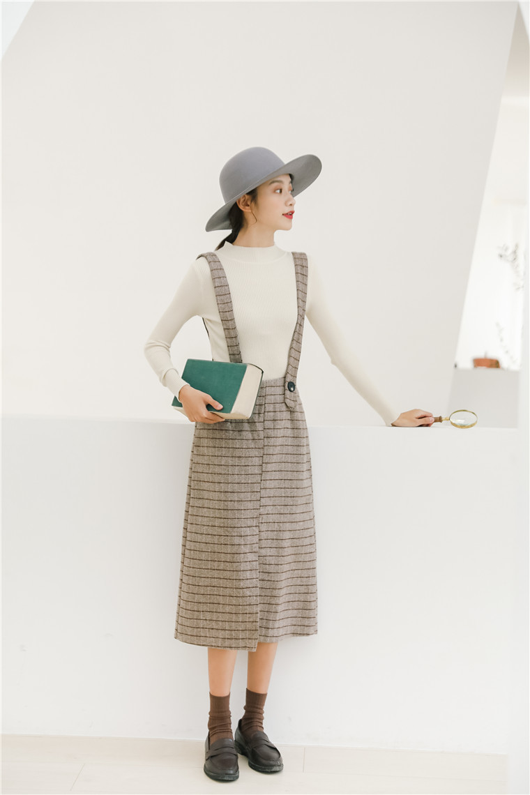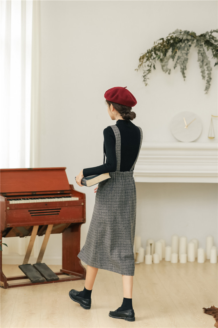 落ち着いたカラーがレトロで大人っぽい雰囲気の膝下丈ジャンバースカートです。