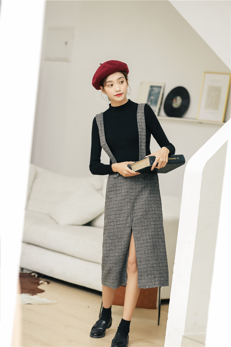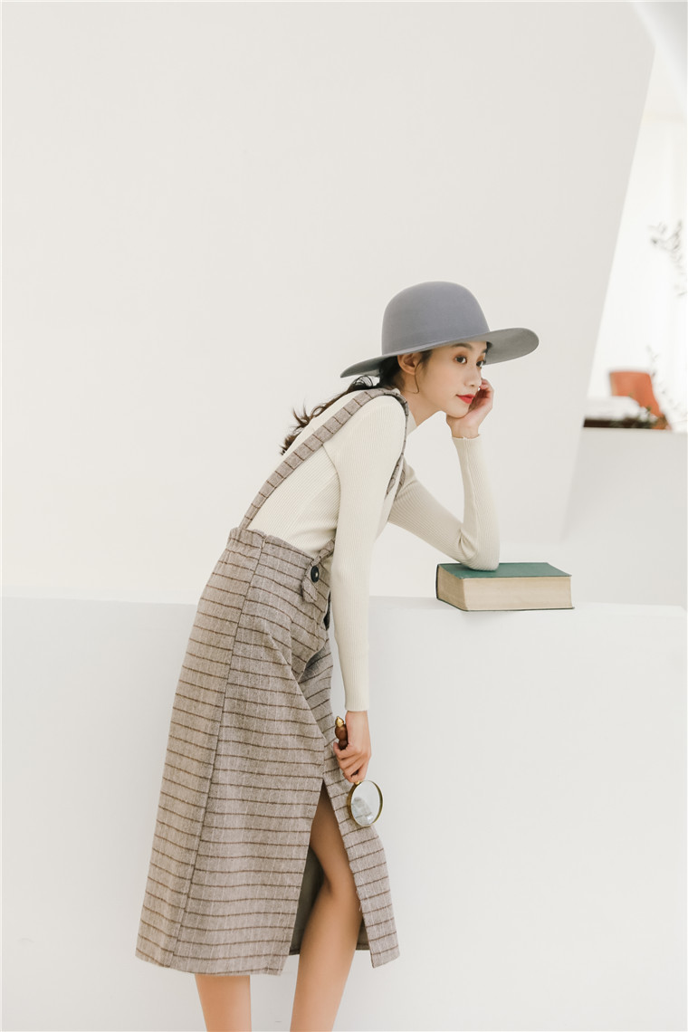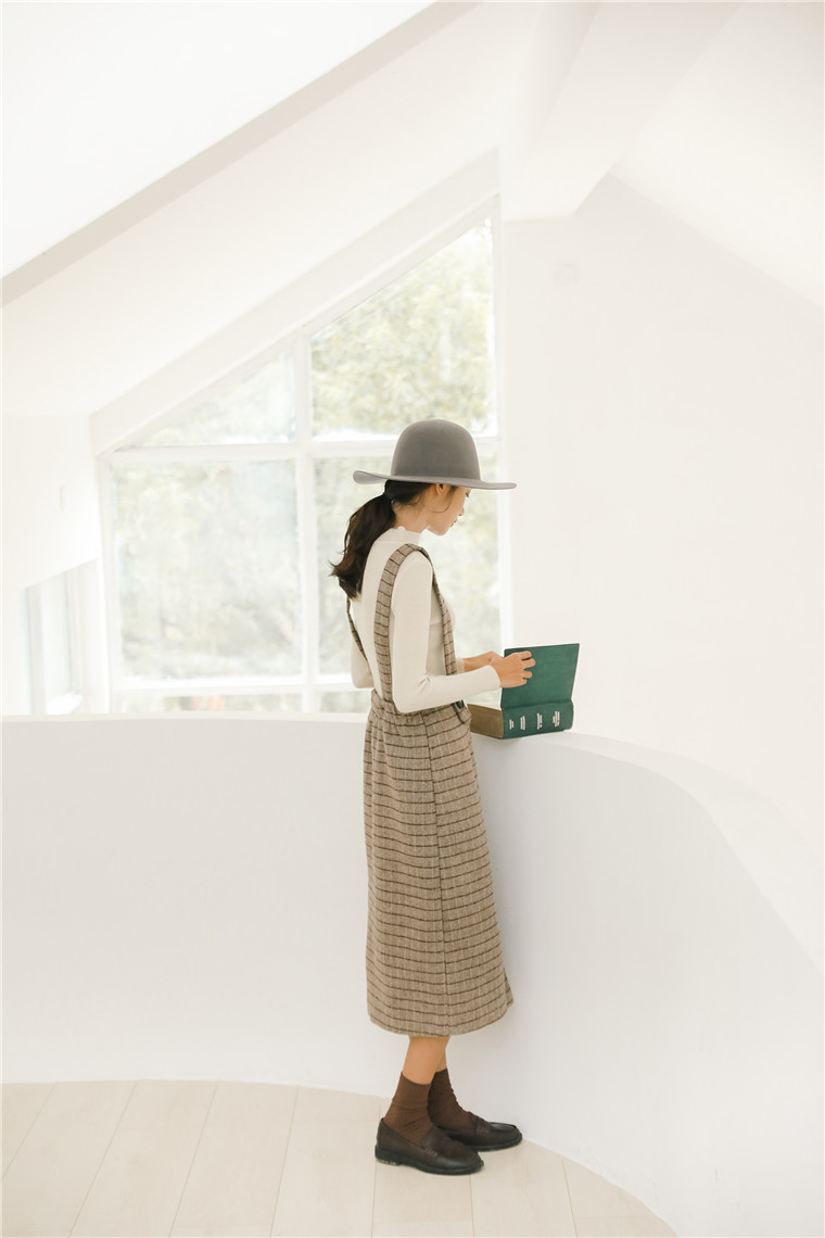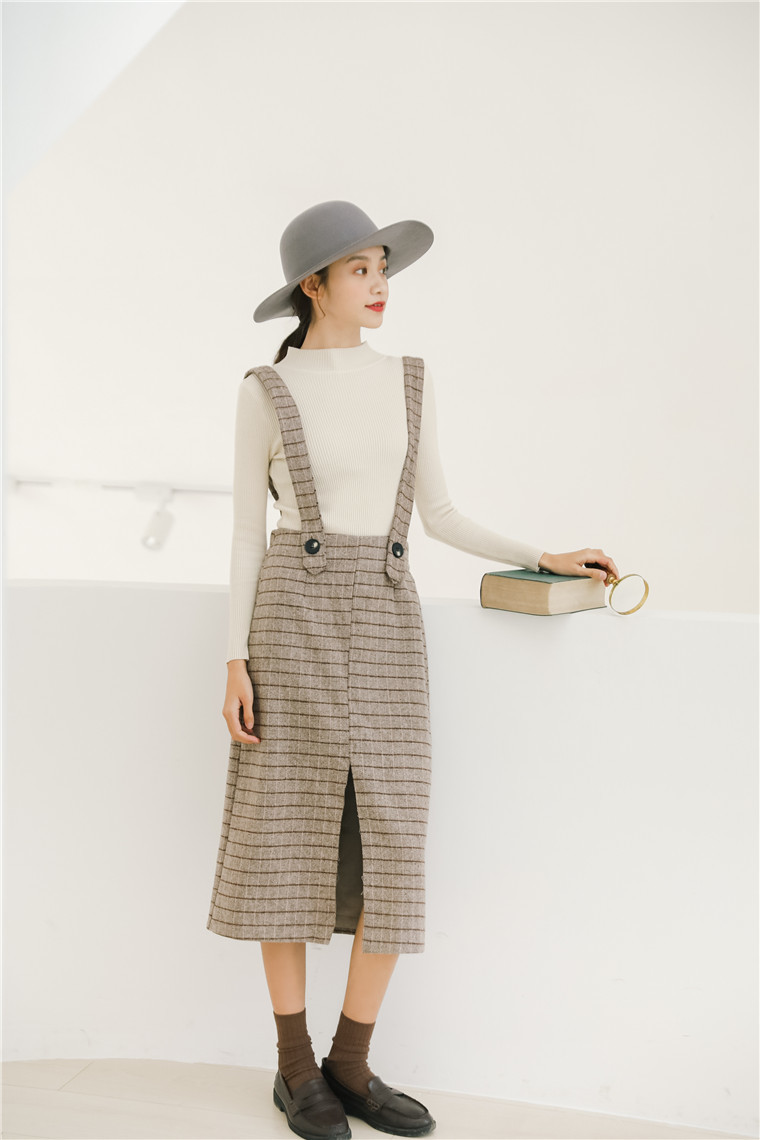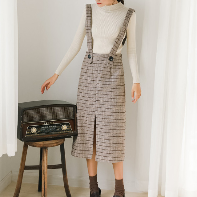 落ち着いたカラーがレトロで大人っぽい雰囲気の膝下丈ジャンバースカートです。