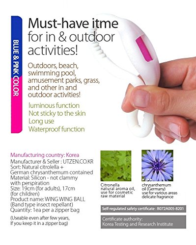 -. Brand : wing wing ball -. Feature : Must have item in the summer,Strong Bug Repellent / Useable for any one, Waterproof Function / Not stick to skin becuase it is made of special silicon material / Containvegatable oil for long use / Practical and useful for everyone of all age -. Label : Korea, Republic of -. Manufacturer : Korea, Republic of -. ProductGroup : Lawn & Patio -. ProductTypeName : OUTDOOR_LIVING -. Publisher : Korea, Republic of -. Studio : Korea, Republic of -. Title : Mosquito Repeller Bracelet Mosquito Eradication Band Summer Ring Bugs Ring on The Wrist or The Ankle