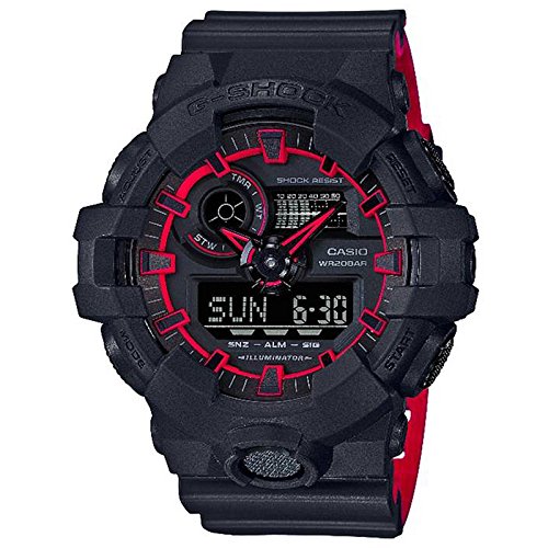 The G-Shock watch by Casio is perfect for any athletic man This watch is made with a resin band and case These long-lasting materials guarantee extended use of the product and a satisfied owner The black band black dial and red hands add to the tough exterior This piece is also crafted with a sturdy mineral crystal to protect the dial and is powered by a Japanese quartz movement to ensure you are always covered Additionally this product is water resistant up to 200 meters 656 feet 20 atm which is ideal for those who enjoy water sports The durable hardware and unmatched quality of the G-Shock watch by Casio will help you accomplish anything you put your mind toFeature