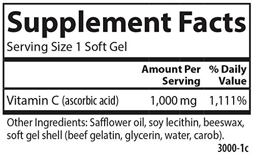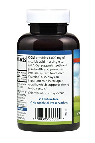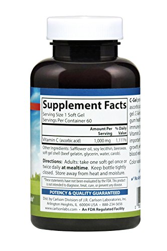 Vitamin C is one of the most popular vitamins taken. As an essential antioxidant it supports healthy immune system function, promotes collagen growth, and supports teeth and gum tissue health. Each Carlson C-Gel soft gel provides 1,000 mg of vitamin C.Feature