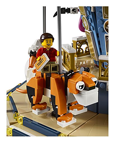 Experience the majestic carousel with a wealth of delightful features, including a large textile canopy, ornate reflective rounding boards with blue and gold detailing, reflective center panels, and a 2-tier deck comprising a raised boarding platform with handrail and a main platform with 5 buildable animal rides, including a white Swan and 4 moving animals. Turn the crank and see the elephant, Tiger, Flamingo and frog move up and down as the carousel rotates. This delightful LEGO Creator Expert 6224318 has an iconic elegance that evokes feelings of nostalgia, Romance and adventure. Upgrade with LEGO power functions for fully motorized operation. Includes 7 minifigures.Feature