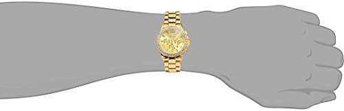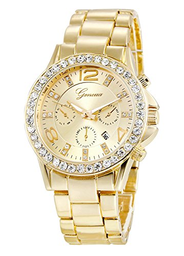 Sunray dial with crystal zircon analog indices and three non functional subdials, just for decoration. Round watch featuring gold-tone case with crystal-inset bezel, not water resistant