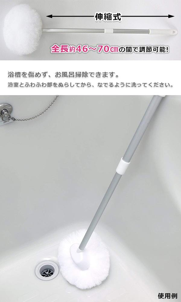 全長約46~70cmの間で自由に長さを調整できます。柔らかい網目繊維が、水だけで湯アカ・ぬめりをスッキリ落とします。 製造国:柄:中国、頭:日本 素材・材質:柄:アルミニウム、ポリプロピレン、ABS樹脂頭:ポリプロピレン 商品サイズ:(約)幅16×奥行10.5×長さ46~70cm(伸縮) ※サプライヤー直送品 ご注文後3~4営業日後の出荷となります【商品名】BATH 浴室清掃 ふわふわバスクリーナー