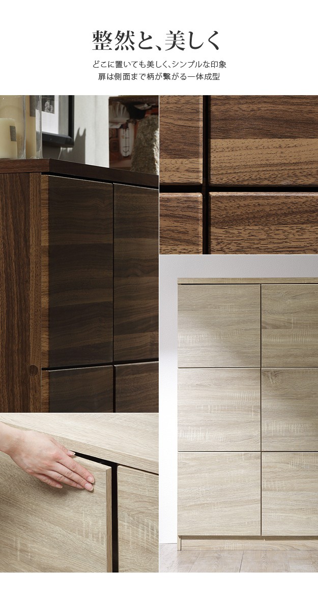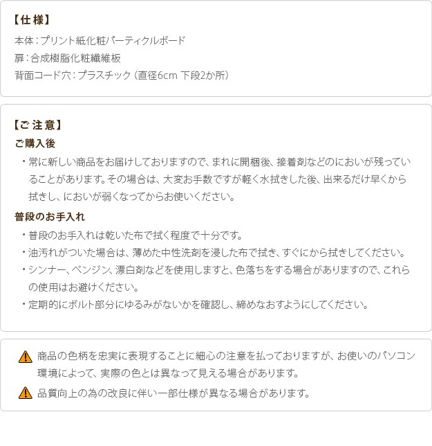 ※メーカー直送のため代金引換はお受けできません。※沖縄・一部離島は別途送料がかかります。お見積もりいたしますのでお問い合わせ下さい。【カラーバリエーション】ウォールナット柄・ホワイトオーク柄【仕様】本体:プリント紙化粧パーティクルボード扉:合成樹脂化粧繊維板◎組立式【サイズ】[ヨコ型]幅107x奥行29.5x高さ80cm重量:30.5kg上段扉内内寸(間口):幅32.5(30.5)x奥行26x高さ35(33.5)cm下段扉内内寸(間口):幅32.5(30.5)x奥行26x高さ33(31.5)cm前板サイズ:幅35x高さ35cm・厚み15mm[タテ型]幅71.5x奥行29.5x高さ115.5cm重量:27.5kg上段扉内内寸(間口):横33(30.5)x奥行26x縦35(33.5)cm中段扉内内寸(間口):幅33(30.5)x奥行26x高さ34(32.5)cm下段扉内内寸(間口):横33(30.5)x奥行26x縦33(31.5)cm前板サイズ:横35x縦35cm・厚み15mm株式会社ナカムラ(F0800442)