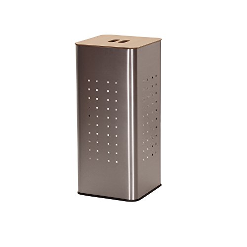 Household Essentials 7080-1 Square Metal Laundry Hamper -Removable Liner Bag and Wood Lid - Stainless Steel