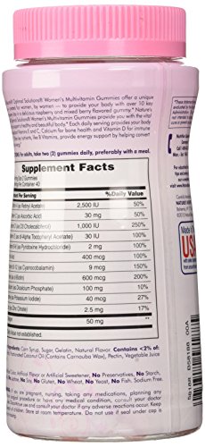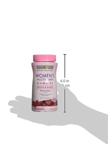 -. Binding : Health and Beauty -. Brand : Nature's Bounty -. EAN : 0074312581885 -. Feature : Energy support / Supports bone and immune health / Supplies over 10 key nutrients for health and beauty / Delicious Raspberry flavored gummies / These statements have not been evaluated by the Food and Drug Administration, this product is not intended to diagnose, treat, cure or prevent any disease -. IsAdultProduct : 0 -. Label : NBTY.inc - US Nutrition,inc. -. Manufacturer : NBTY.inc - US Nutrition,inc. -. NumberOfItems : 1 -. PackageQuantity : 1 -. ProductGroup : Health and Beauty -. ProductTypeName : HEALTH_PERSONAL_CARE -. PublicationDate : 2015-04-23 -. Publisher : NBTY.inc - US Nutrition,inc. -. ReleaseDate : 2015-04-20 -. Studio : NBTY.inc - US Nutrition,inc. -. Title : Natures Bounty Optimal Solutions Women's Multivitamin Gummies, 80 Count -. UPC : 074312581885