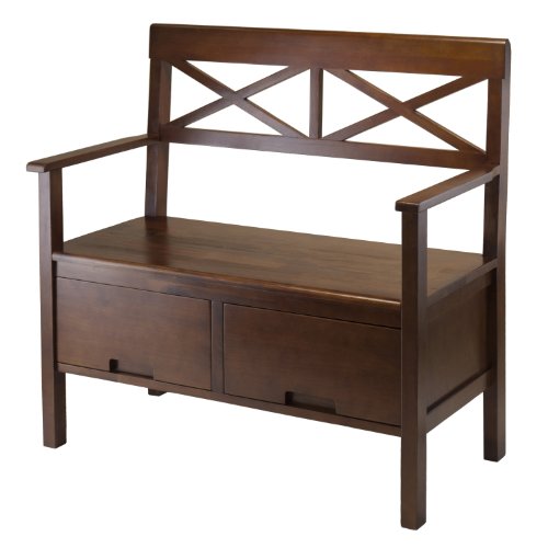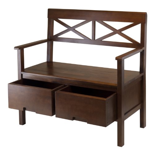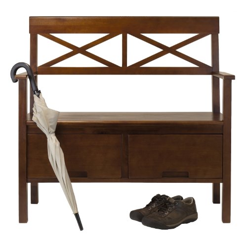 -. Feature : Bench for seating / Back rest with X design / 2 Drawers for storage / Antique walnut / Assembly required